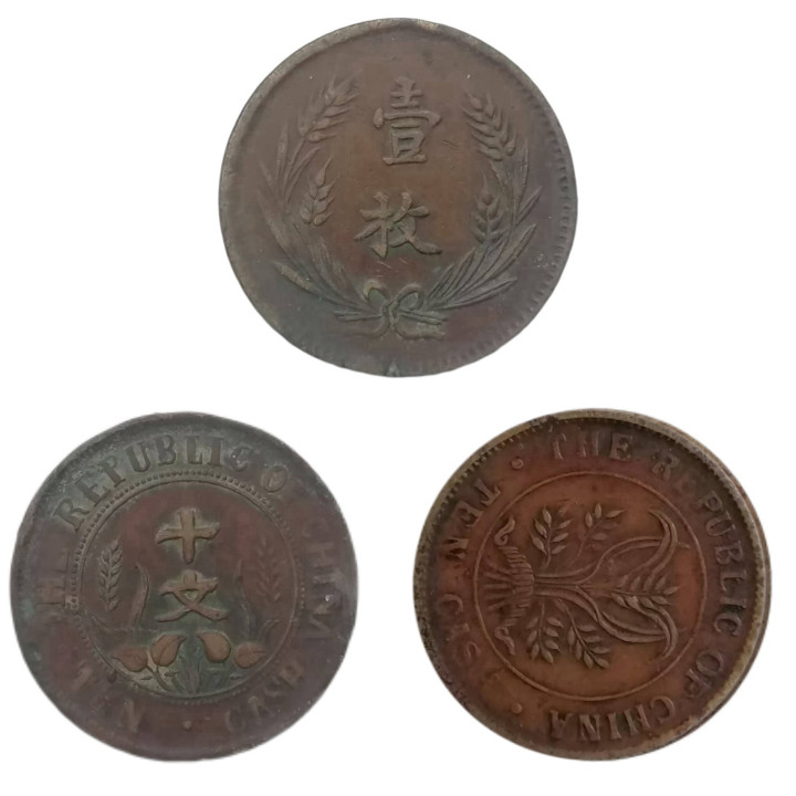 三枚硬币均为铜质铸造。铜,在民国初期是主要的货币材质之一,它易于冶炼、铸造,且适合小额交易的需求。历经近百年的岁月,铜质币面留下了自然的氧化痕迹与包浆。这些包浆,有的深沉,有的斑驳,每一枚都独一无二,它们是时光流逝的见证,为硬币增添了 “历史的质感”。当我们用手触摸这些硬币,感受到的不仅是金属的凉温,更是近百年岁月的厚重。
